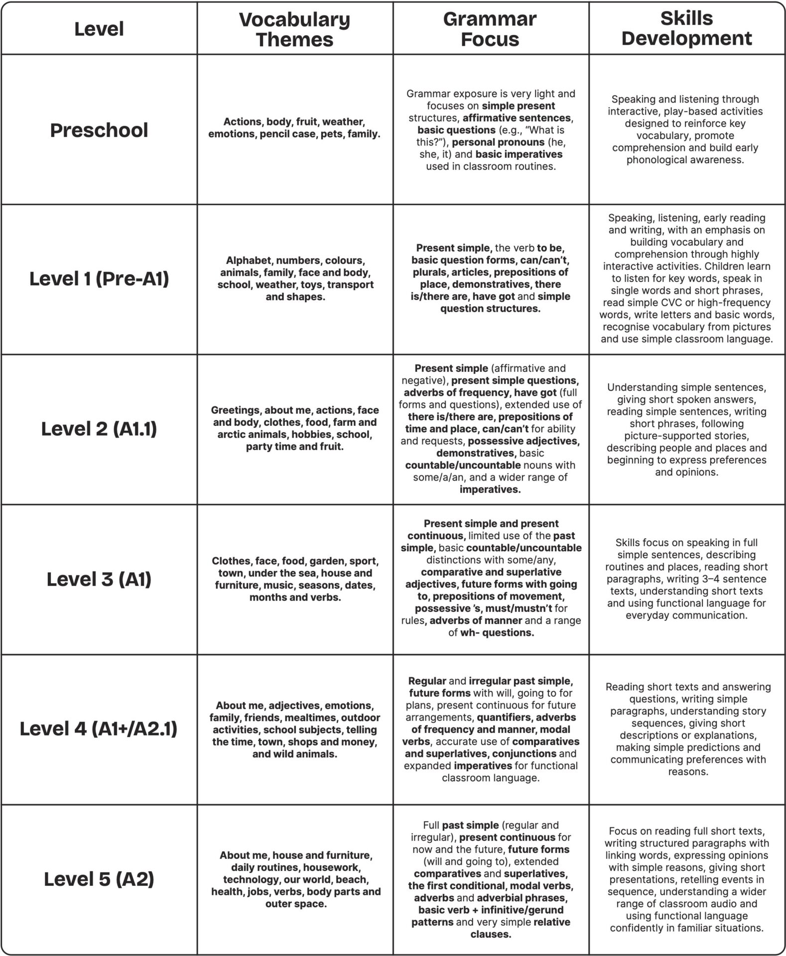 Regular and irregular past simple, future forms with will, going to for plans, present continuous for future arrangements, quantifiers, adverbs of frequency and manner, modal verbs, accurate use of comparatives and superlatives, conjunctions and expanded imperatives for functional classroom language.